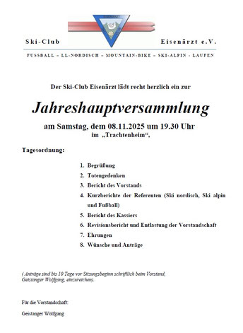 Der Skiclub Eisenärzt lädt alle recht herzlich am Samstag, den 08.11.2025 um 19:30 zur Jahreshauptversammlung ins Trachtenheim in Eisenärzt ein. Die Vorstandschaft freut sich auf zahlreiches Erscheinen.